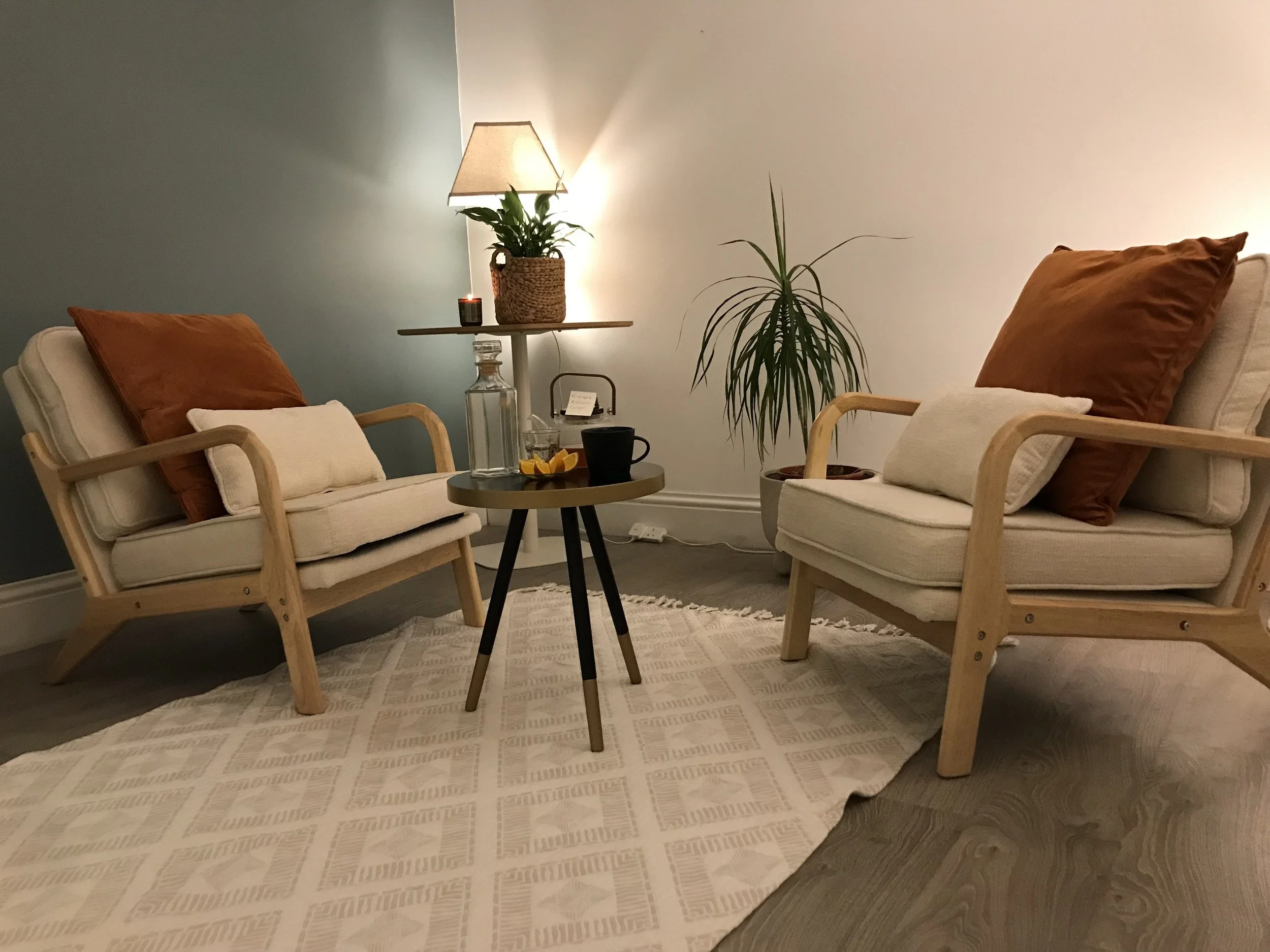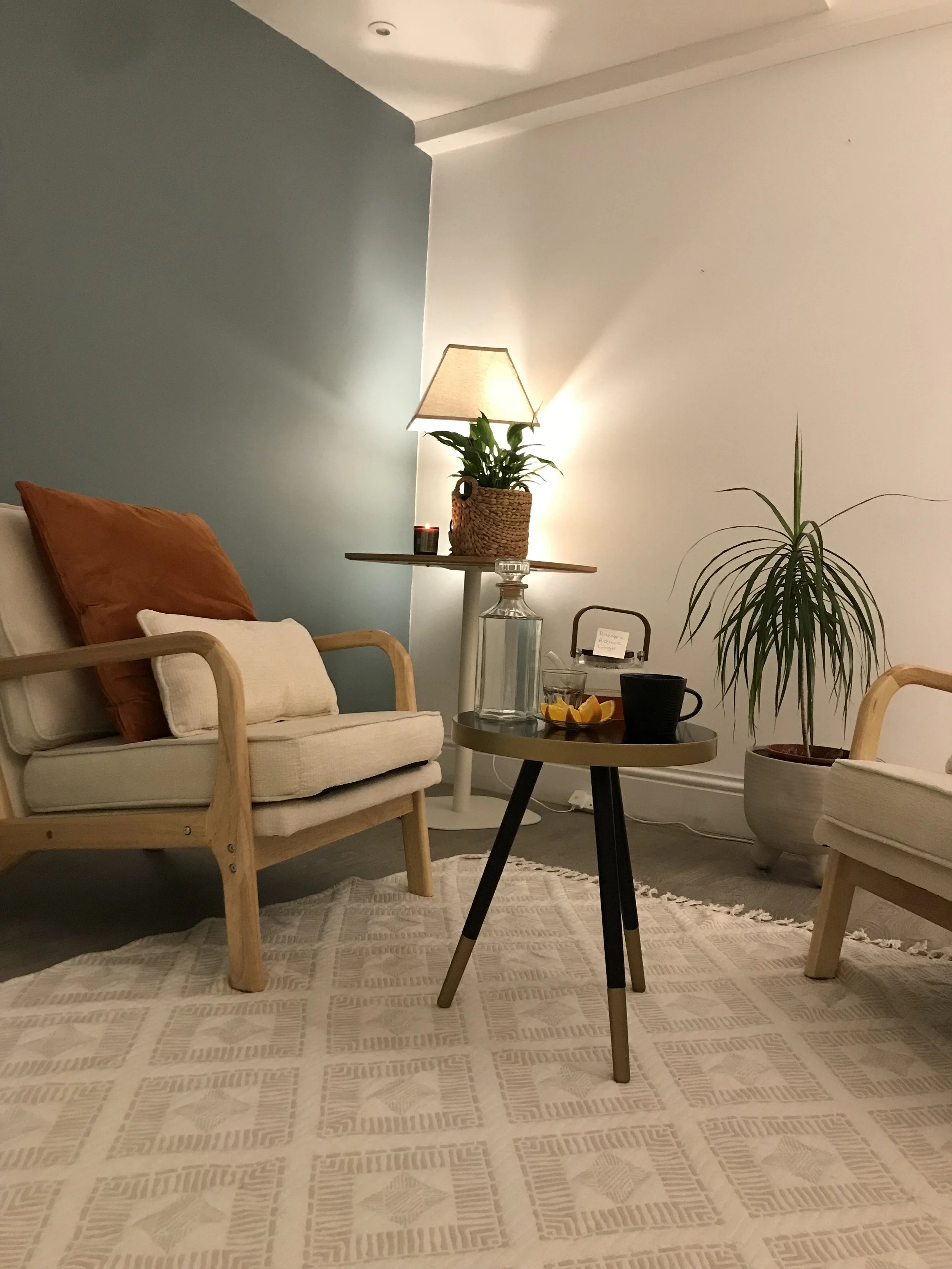 Therapy room 6 is a comfortable space intentionally designed for counselling and talking therapies. Located in a private corner of the building, this calm and relaxing space comes with tea and coffee making facilities, wi-fi note pad and pencils.